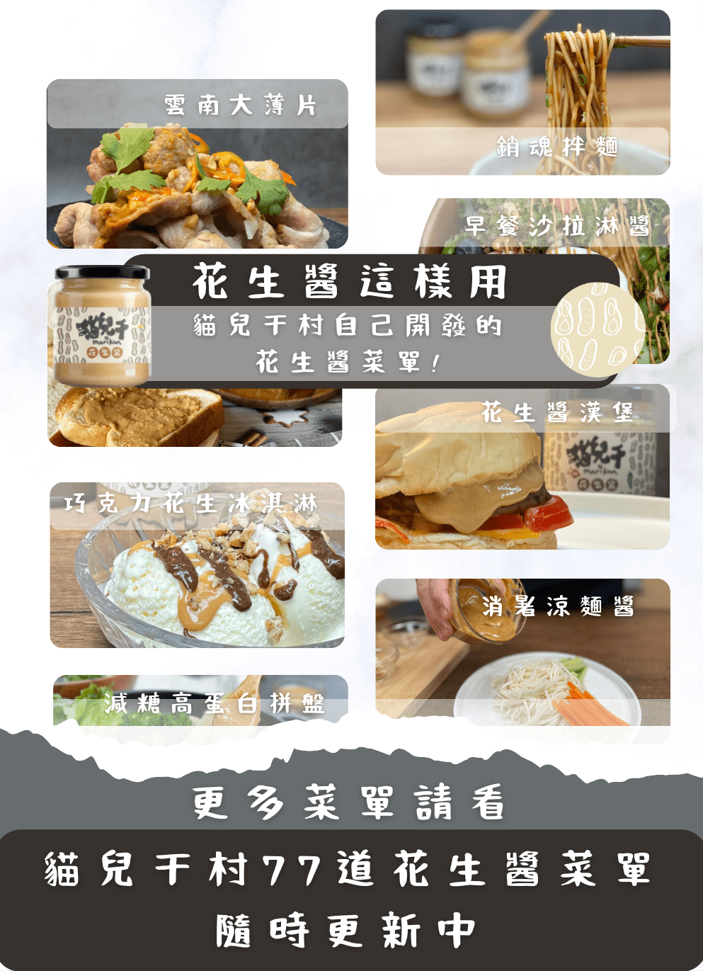 .除了抹吐司之外,還有77種不同的花生醬料理方式→花生醬涼麵醬、花生醬銷魂拌麵醬、花生醬餅乾、花生醬口水雞,絕不怕用不完!