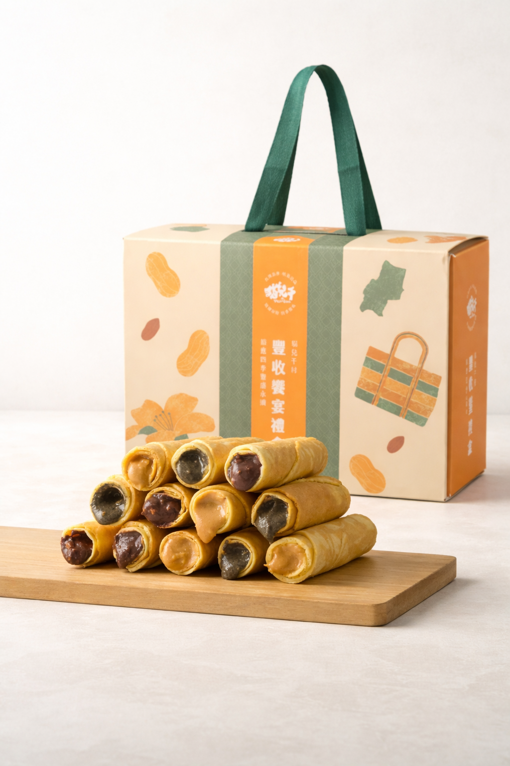 | 品名:貓兒干村豐收饗宴禮盒(花生醬蛋捲組合) 內容:花生醬蛋捲15支裝 重量:(下方清單) 尺寸:外盒22*17.4*8.3cccm 保存期限: (下方清單) 【禮盒預計1/5起可出貨、備貨時間約10個工作天,可彈性調整】 內容物清單: (1)花生醬厚蛋捲花生濃濃25g/支*5支,常溫45天 (2)花生醬厚蛋捲芝麻粒粒25g/支*5支,常溫45天 (3)花生醬厚蛋捲黑巧法芙娜25g/支*5支,常溫45天 禮盒本身有提袋,不另附紙袋 |