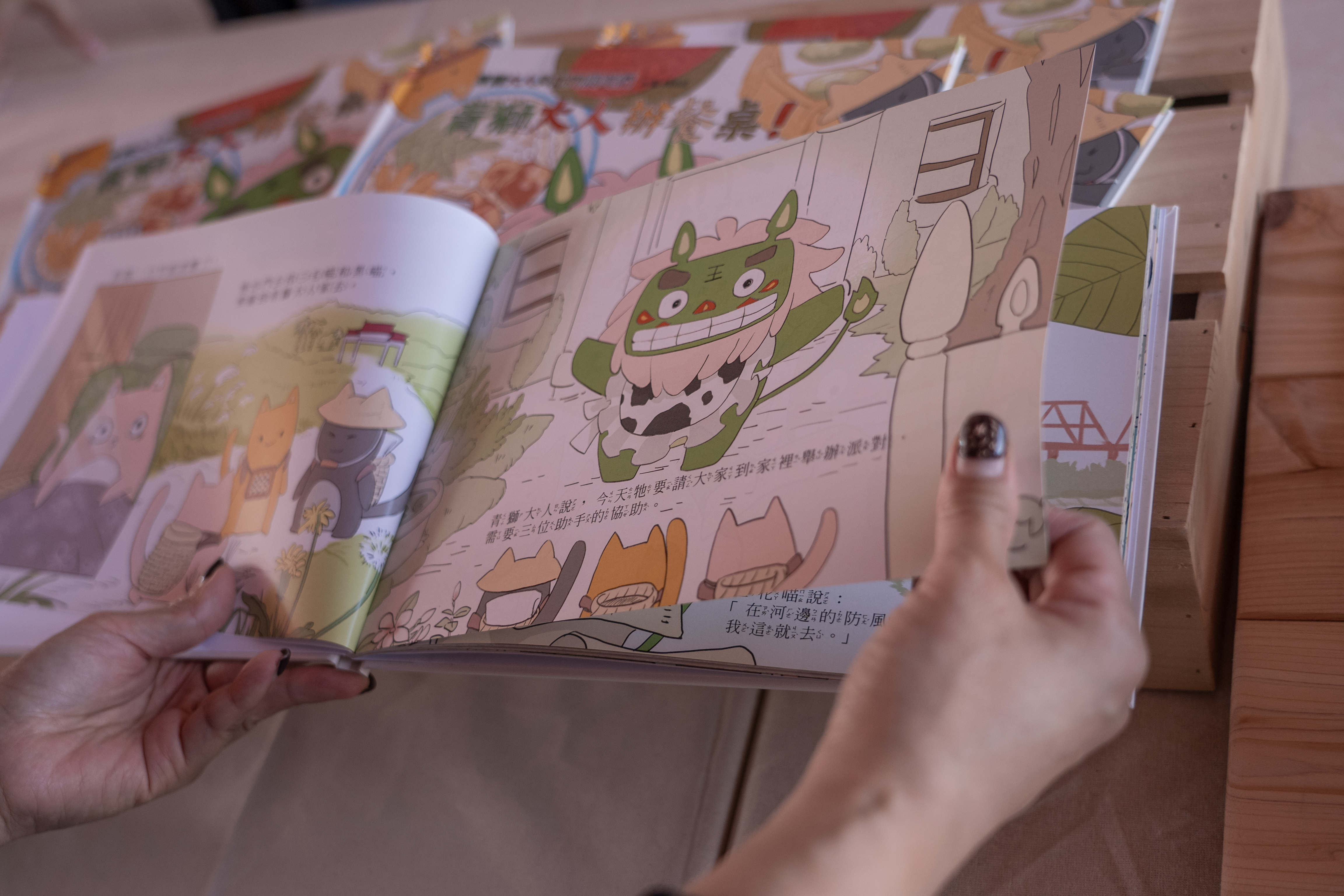 目前青獅大人與動物朋友系列繪本,共有「青獅大人辦餐桌」、「青獅大人踩街趣」,並將持續推出青獅大人牧場系列主題,青獅大人花生系列,推廣更多在地的歡樂與可愛。